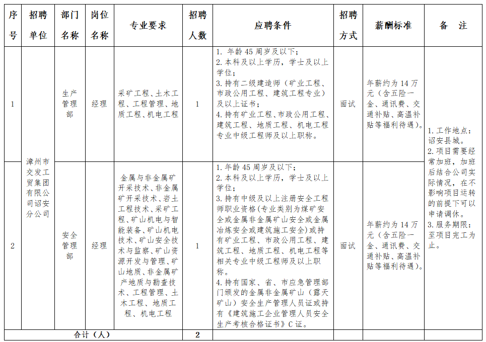 我司于2025年8月12日发布《漳州市交发工贸集团有限公司诏安分公司市场化用工人员招聘公告》,共6个岗位,拟招聘7人。截至报名结束,其中生产管理部经理、安全管理部经理两个岗位无符合条件人员报名,结合我司工作实际,决定对以上两个岗位延长报名时间,现将相关事项公告如下: