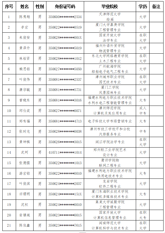 根据《2025年漳州市金盾城市服务集团有限公司公开招聘公告》《漳州市金盾城市服务集团有限公司用工管理办法》等有关规定,经过网上报名、资格审查、笔试、面试、实操考核、政审体检合格后,现将2025年漳州市金盾城市服务集团有限公司公开招聘拟录用对象予以公示,公示期为5个工作日,公示名单如下: